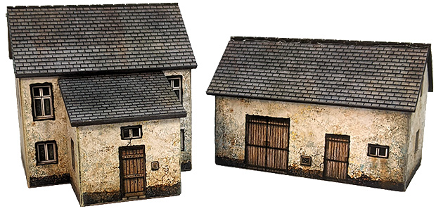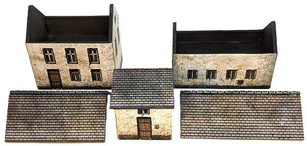 Two roofs are removable. The bottom side of each building is open, allowing for the placement of troops underneath the model.