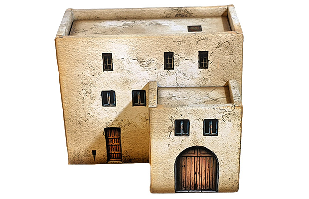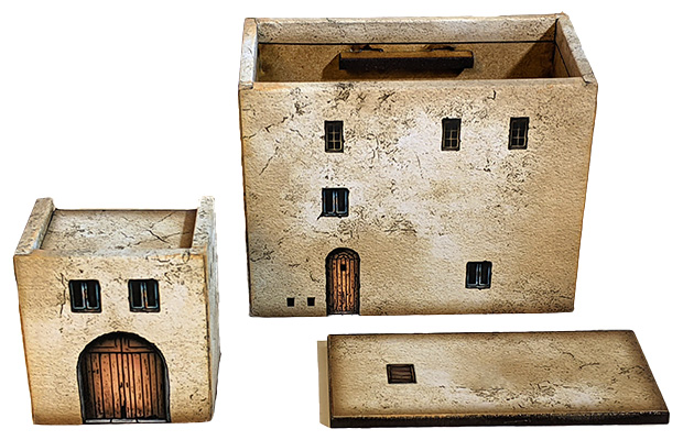 One roof is removable. The bottom side of each building is open, allowing for the placement of troops underneath the model.