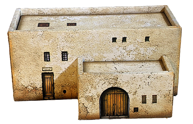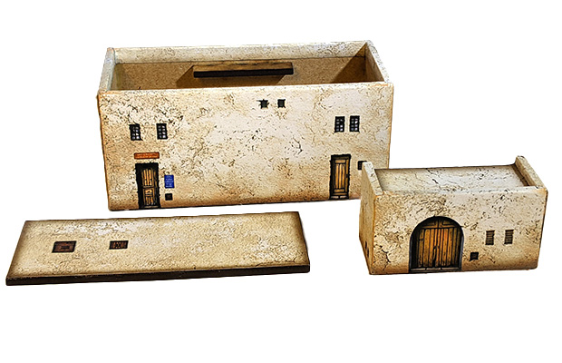 One roof is removable. The bottom side of each building is open, allowing for the placement of troops underneath the model.