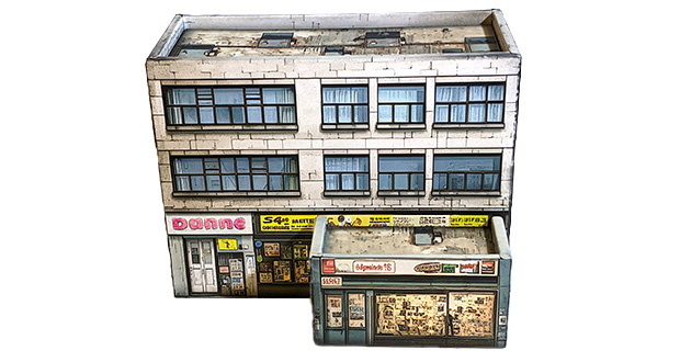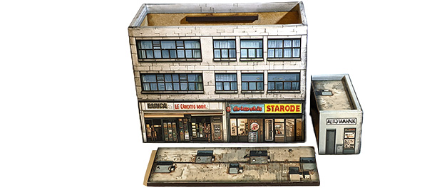 One roof is removable. The bottom side of each building is open, allowing for the placement of troops underneath the model.