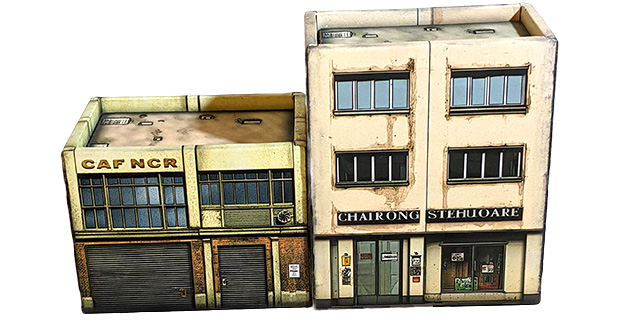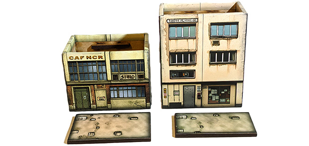 Two roofs are removable. The bottom side of each building is open, allowing for the placement of troops underneath the model.
