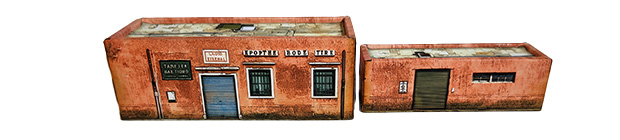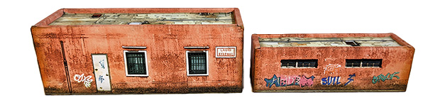 The bottom side of each building is open, allowing for the placement of troops underneath the model.